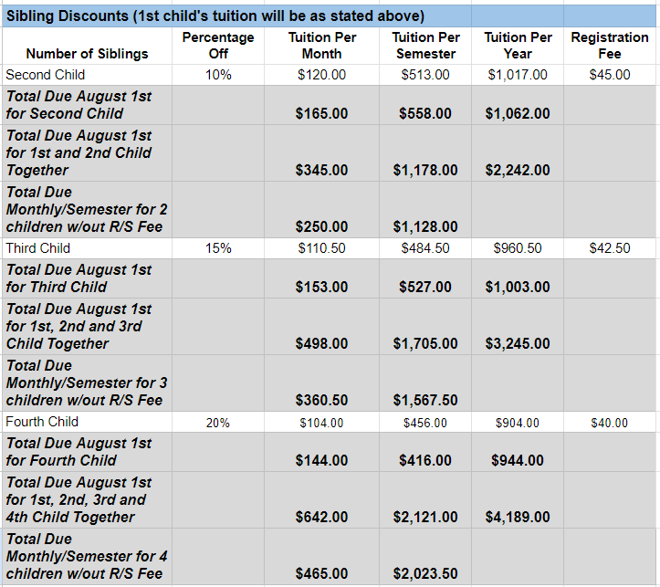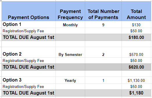 Tuition is $130 per month (September-May). Tuition payments are due by the 1st of each month, with the exception of September. This will be paid by August 1st.